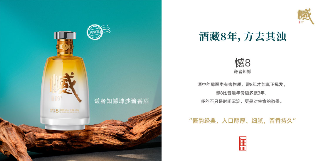 酒藏8年,方去其浊。酒中的醇醛类有害物质,需经过8年才能真正挥发出来。憾8比普通年份酒多藏3年,多的不只是时间沉淀,更是对生命的敬畏。